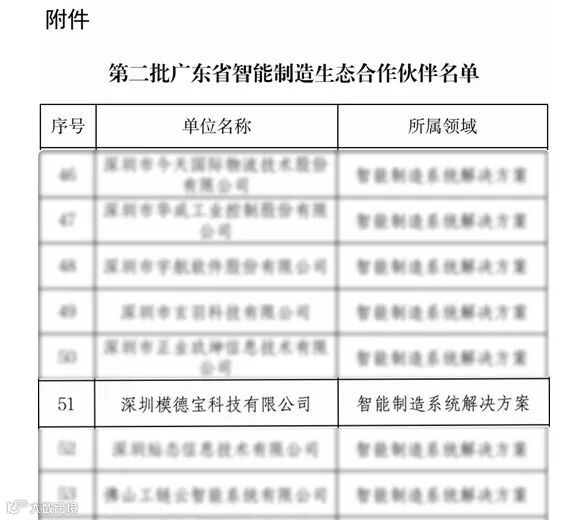• 为加快培育智能制造生态体系,支撑战略性产业集群发展,落实《广东省智能制造生态合作伙伴行动计划(2022年)》,近日,广东省工业和信息化厅公布了第二批广东省智能制造生态合作伙伴名单,模德宝凭借多年来在智能制造领域的技术积累和创新实力成功入围。