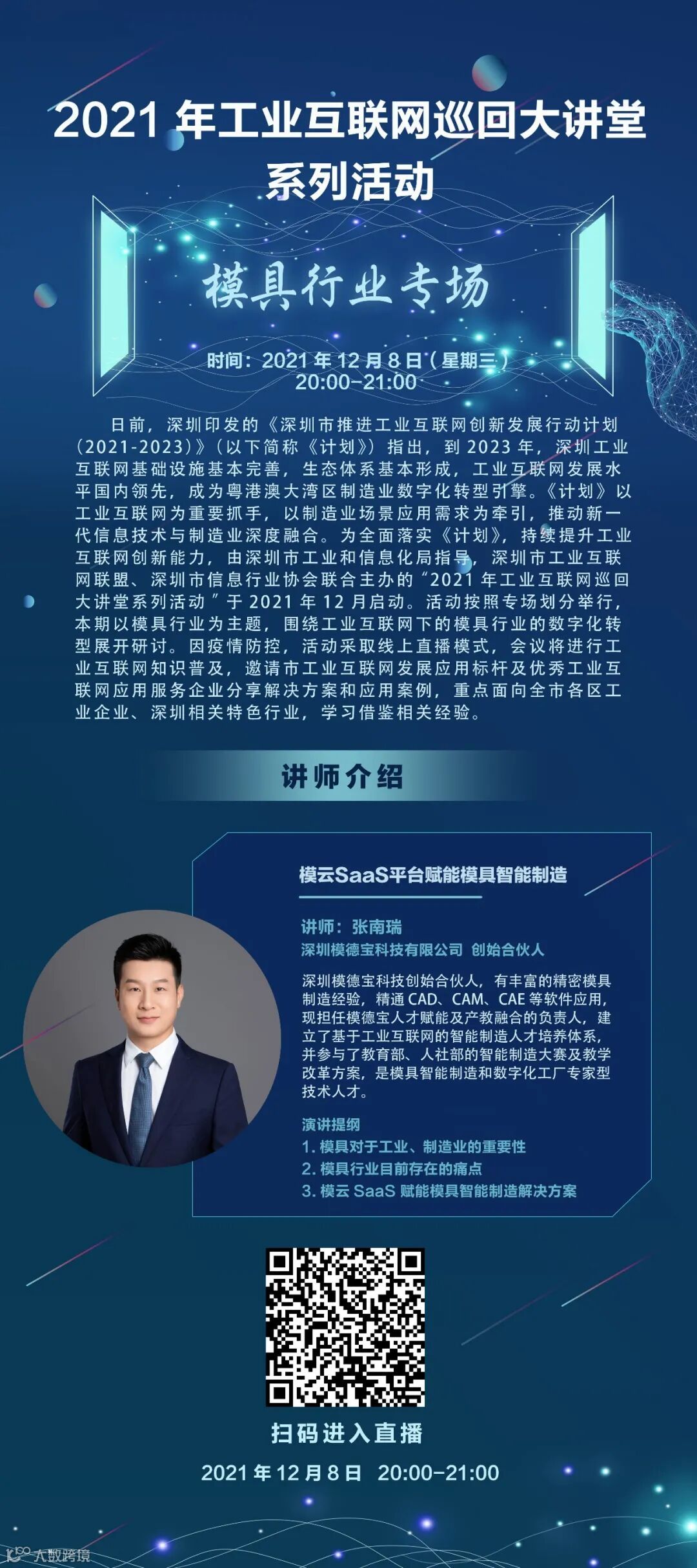 由深圳市工业和信息化局指导,深圳市工业互联网联盟和深圳市信息行业协会主办的2021年工业互联网巡回大讲堂系列活动之模具行业专场将于2021年12月8日晚8点-9点开启专场直播。深圳模德宝科技有限公司作为模具专场支持单位将带来《模云SaaS平台赋能模具智能制造》,扫码即可进入直播,敬请期待!