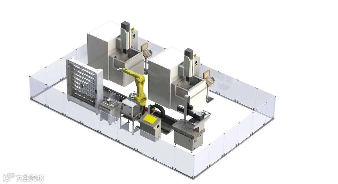 此方案由两台汉霸HGS45高精密电火花机床、一台6轴机器人(含导轨、机器人控制器)、一台海克斯康Tigo SF365三坐标测量机、立体料架、模德宝柔性制造自动化系统组成。该方案实现机器人自动化上料、电极CMM检测、EDM自动化编程、工件EDM自动化加工、工件CMM检测的全流程自动化!