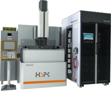 该方案由一台汉霸HGS45高精密电火花机床和一台模德宝智能机器人CCR-30组成,可完成电极/钢件的EDM机床自动化上料、换料与下料动作,配合模德宝柔性制造自动化系统,可轻松完成电极的EDM自动化加工,并对设备状态进行监控,实现放电加工的可视化管理!
