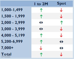 从目前的可用船舶数量来看,市场依然处于比较积极的态势。在过去的四个月中,即期空船的数量约为50艘,上一次市场出现类似情况是在2015年,当时租金指数为800点。目前没有5100TEU以上的即期空船,一些可能会空出的船舶也都相继成交。租家目前不得不开始考虑一些较远(交船日期)并且租期较长的拿船计划。在大船方面,以往的那些灵活租期已经不多见。2000-3000TEU箱船的可用数量从1月份的不到30艘减少到9艘,1200-2000TEU的可用数量则从40多艘减少到约14艘。