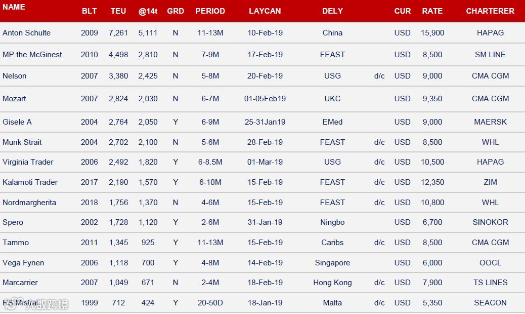 本周市场无论是在新成交还是续租方面,活跃度都有明显增加,其中大部分都是针对中国新年后的需求。豪罗宾逊集装箱租船指数中,最大箱型的日租金平均增长了约1000美元。而超巴拿马船型的租金预计下周会进一步上涨,因为班轮公司都希望提前锁定年后所需吨位。更长时间的租期也逐渐出现,说明班轮公司对市场越来越有信心。5000 TEU以下的船型仍需面对压力,想要扭转目前的局面,有待持续的需求支持。