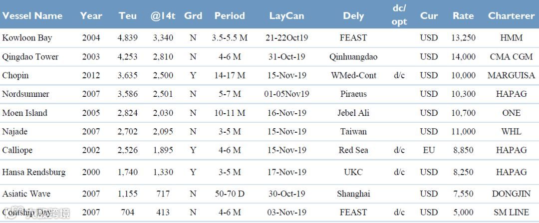 尽管中间船型非常活跃,两头市场却十分安静。较大船型的租金维持在前几周的水平,只有少数进入还船空档的船舶,在争取获得前几周市场增长带来的收益。但在较小的支线船型部分,情况截然相反,大量的空船使船东越来越焦急。那些获得租约的船东觉得幸运,而新的成交越来越难以拿到与之前持平的租金水平。市场早前希望大型船舶租金的增长,将会在年底前拉动小型船舶的租金水平,然而这个期望慢慢破灭。