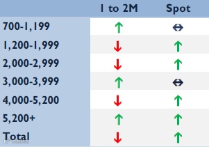 同样,本周指数的变化主要在2500箱位和3500箱位两个部分,分别下跌3.1%和2.2%,而市场的成交也集中在这两个板块。当租金微弱的下降趋势变得明显时,这只是市场的巧合还是暗示了被压抑的需求将会触发?本周,许多空船再次拿到了租约(特别是地中海区域),而且这些成交大部分是新的位置,不是现有租约的续约。对此,这种积极的势头是否延续,将会是下一周大家关注的重点。