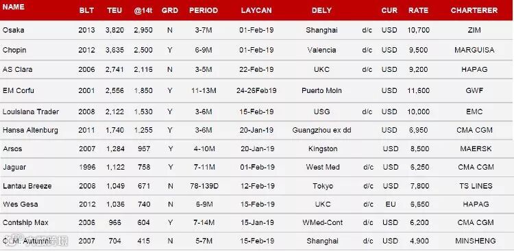 虽然市场的活跃程度和成交量在合理水平,但在即将到来的中国新年之前,市场不会有明显的回升。事实上,与预期相反的是,豪罗宾逊集装箱租金指数本周又下跌了0.78%,即使超巴拿马型船的数量在减少。这个星期,交易量最多的部分是1000-1100 TEU型船。这部分船型的成交量占总体的25%,但租金保持平稳(除了冰级船)。