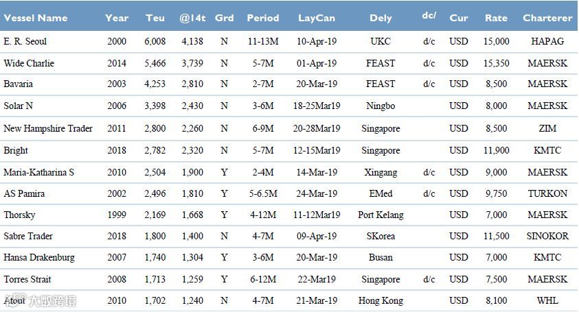上周一共有70多个成交记录,其中一半以上是新的成交。自中国农历新年以来,成交量的增加促动豪罗宾逊集装箱租金指数上涨了3.4%(HRCI INDEX 625)。但迄今为止,拉升租金的主要是5500-8500 TEU大小的集装箱船,这部分船型日租金涨幅平均为3500美元或15%。自年初以来,由于市场上Panamaxmax和Panamax空船数量过多,租金水平维持在7000-8500美元/天。不过,随着超巴拿马型空船数量的减少,迫使租家考虑使用巴拿马型船作为替代。这使得5000 TEU船型本周的成交出现了增长,剩余空船数量也下降到了10条左右。尽管5000 TEU船型还没有走出困境,但租金水平终于出现了好转迹象。小巴拿马船依旧低迷,但自下而上和自上而下需求的增加,应该会开始推动4250 TEU这部分船型租金的上涨。