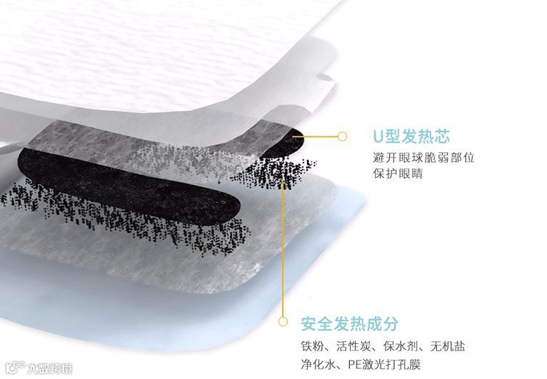 利用这些热量热使眼罩内部材料中水份均匀释放蒸发,形成细微温润的水蒸汽,然后透过通气、透湿的纤维面料与眼部接触。