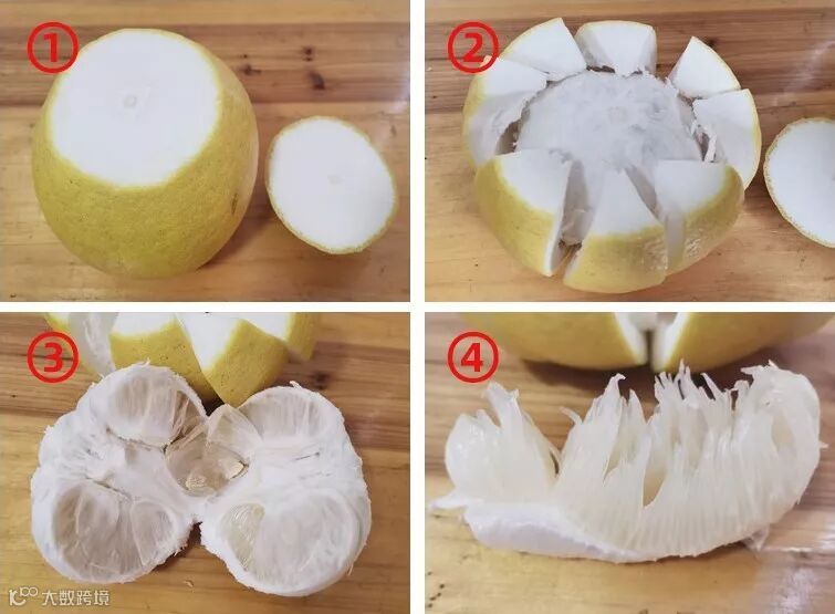 剥皮时千万不要用刀直接横切柚子,这样会把籽和皮囊上的苦涩汁带到肉上面,这样食用会感觉到苦涩,敬请注意!