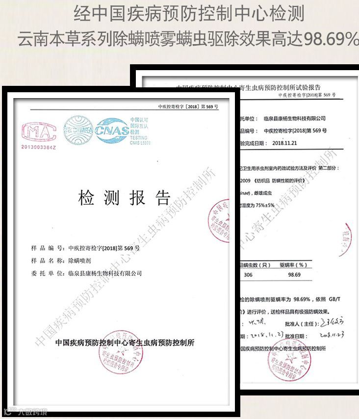 经过中国疾控预防控制中心检测,除螨喷雾剂的除螨抑螨效果可达到98.69%,喷完10秒之后,螨虫进入深度休克。