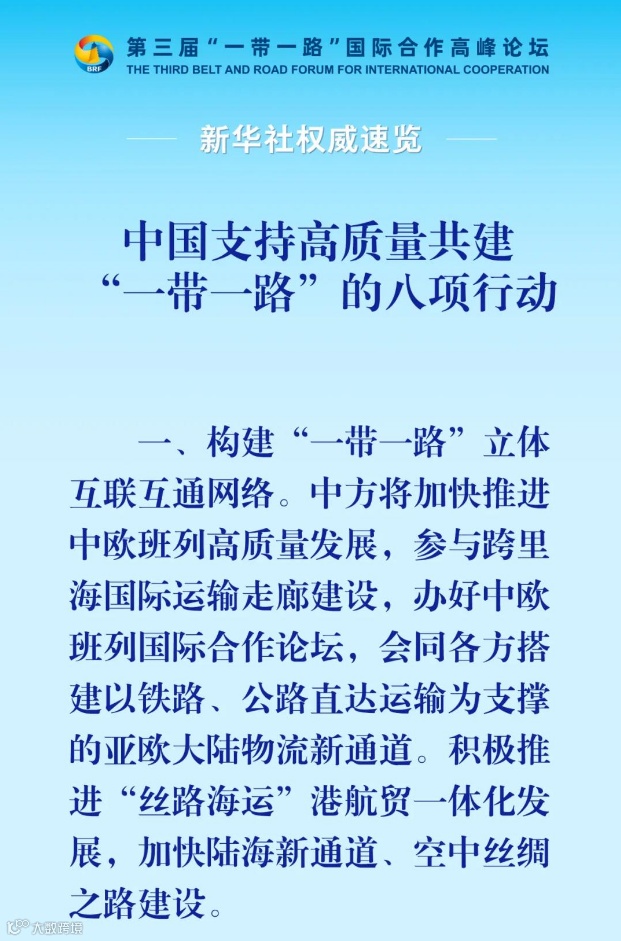 习主席宣布中国支持高质量共建的“一带一路”的八项行动,从构建立体互联互通网络,到支持建设开放型世界经济;从开展务实合作,到促进绿色发展;从推动科技创新,到支持民间交往;从建设廉洁之路,到完善“一带一路”国际合作机制,一个个务实举措、计划,将在更大范围、更深层次、推动高质量共建“一带一路”,向着共同发展繁荣的未来不断迈进。