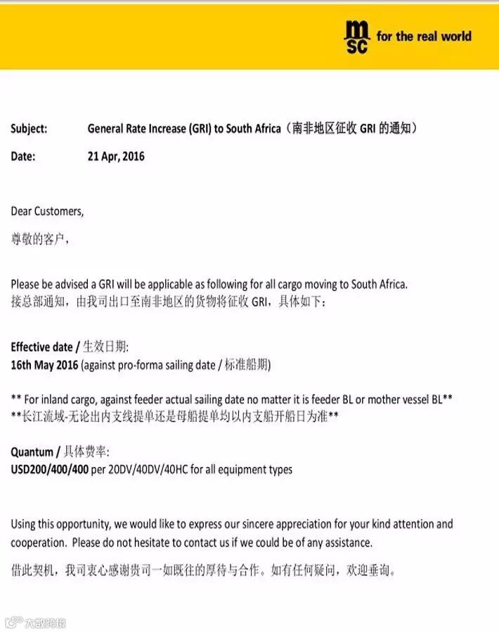 接MSC(地中海航运)通知,自2016年5月15日起,南非将征收GRI,请广大朋友们知悉,并提前做好出货安排!
