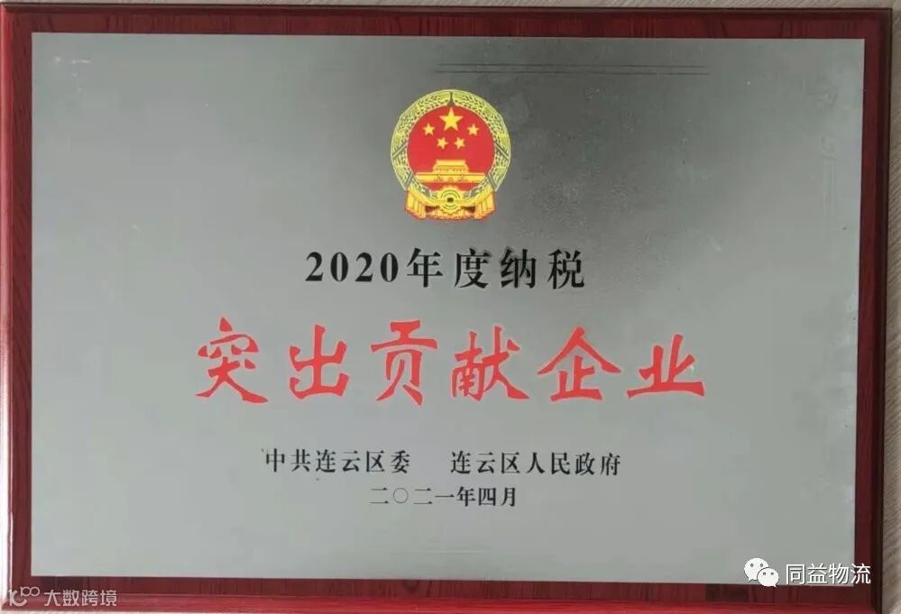 近日,同益物流获连云区2020年度“纳税突出贡献企业”荣誉称号,这是我公司连续多年获此殊荣。