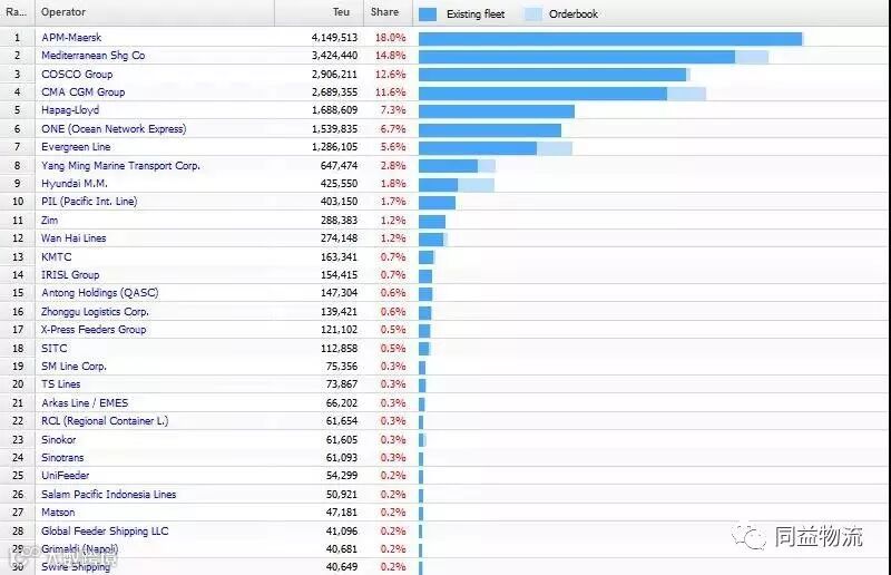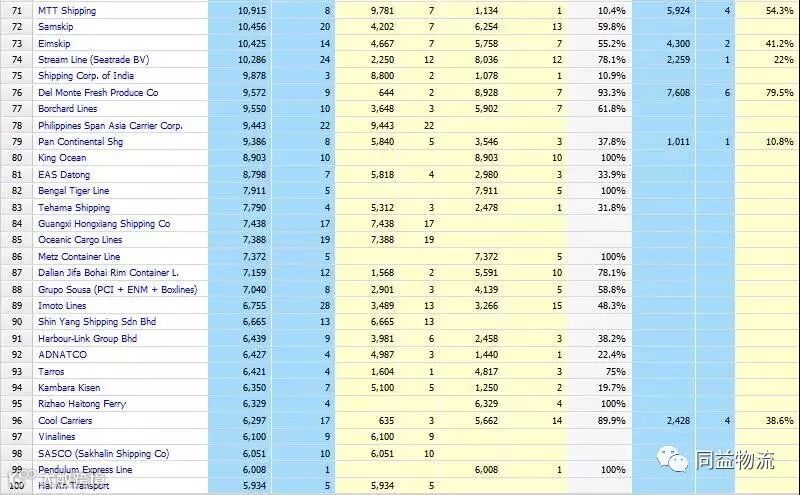 排名位列第十一至二十位的分别是:以星航运、万海航运、高丽海运、伊朗国航、安通控股、中谷物流、新加坡X-press、海丰国际、SM商船、德翔航运。根据统计,排名前二十的集装箱班轮公司运力占全球的89.6%。