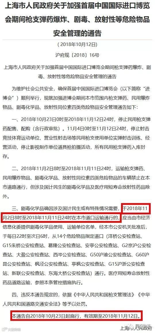 首届中国国际进口博览会还有不到一个月就将拉开帷幕。为维护社会公共安全,上海市政府发布《加强首届中国国际进口博览会期间枪支弹药、爆炸、剧毒、放射性等危险物品安全管理的通告》,通告自2018年10月23日起施行,有效期至2018年11月12日。