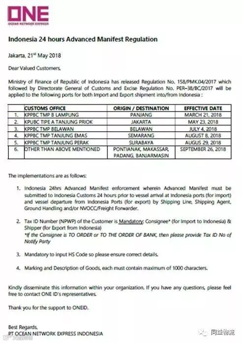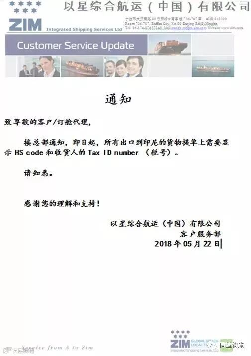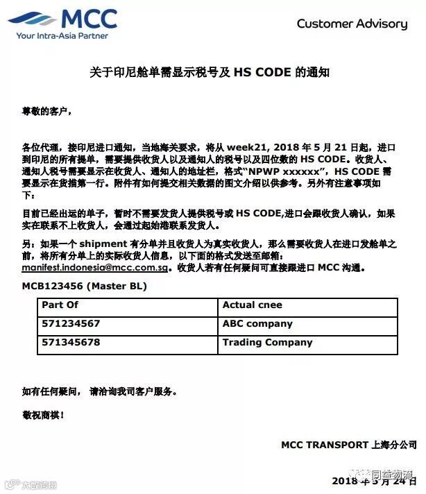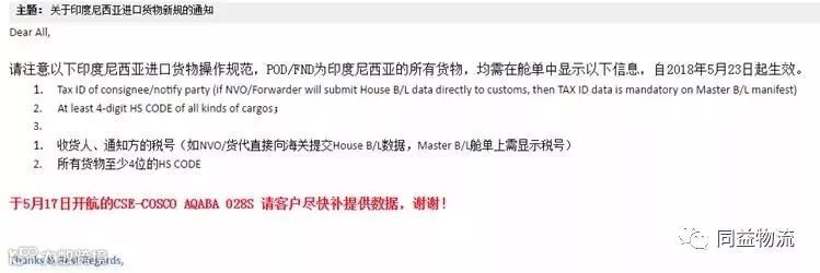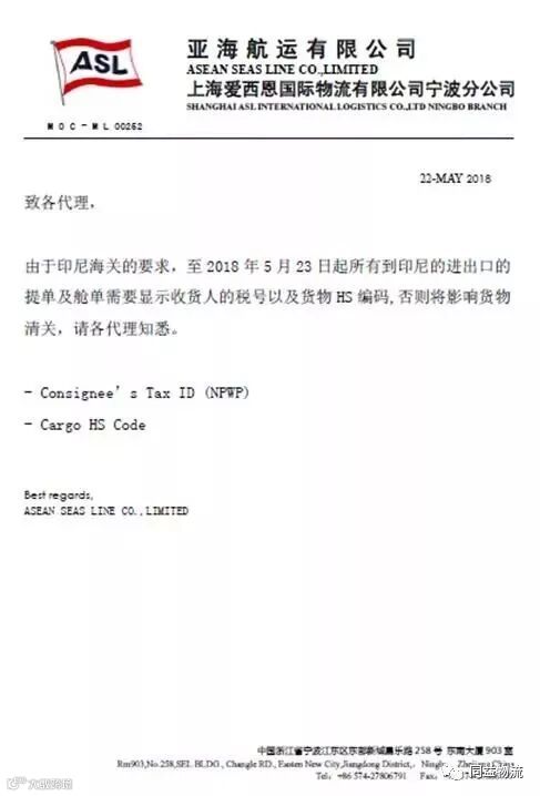 接印尼进口通知,当地海关要求,进口到印尼的所有提单,需要提供收货人以及通知人的税号以及四位数的HS CODE。否则将无法发送目的港海关舱单且收货人无法正常清关。