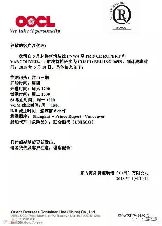 导读:近期接OOCL(东方海外)通知,新增两条航线。