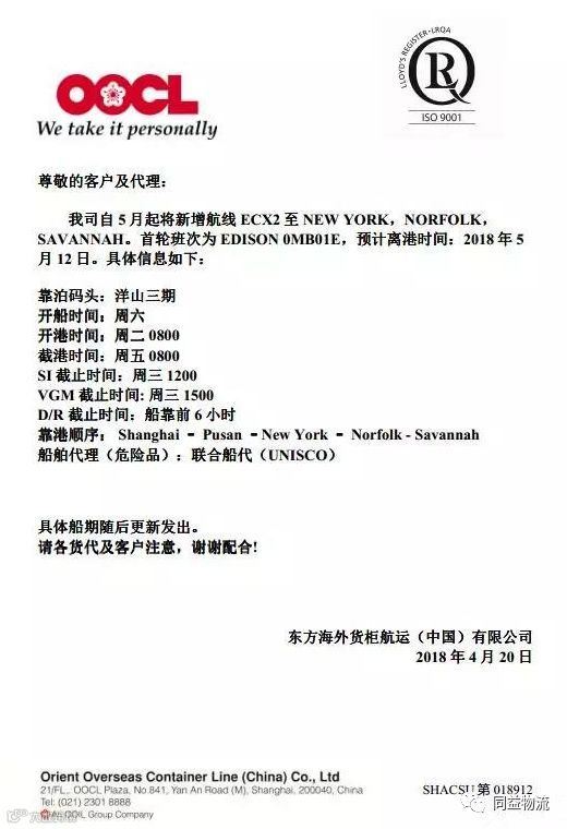 近期接OOCL(东方海外)通知,新增两条航线。