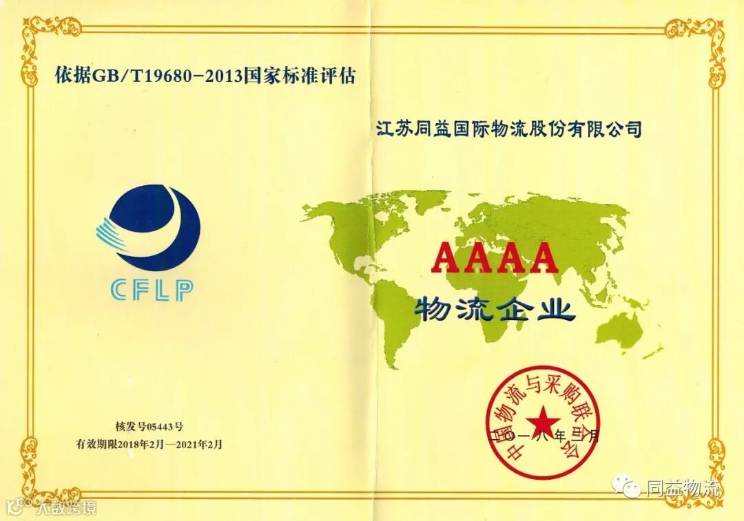 作为目前行业内最具权威性物流企业资质的审评,吸引了国内优秀大型物流企业竞相角逐,大放异彩。早在去年年底,同益物流通过企业申报,顺利进入中国物流与采购联合会审定流程。2018年1月26日中国物流与采购联合会公布了“全国第二十五批A级物流企业名单”,同益物流成功入围。2月正式获得AAAA级物流企业证书。这也是2018年以来继同益物流与淮海工学院正式签订合作框架协议后取得的又一次进步!