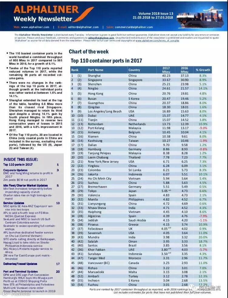 ALPHALINER近日发布Top 110 container ports in 2017数据(见上图表),全球110个商业集装箱港口吞吐量排名中,希腊比雷埃夫斯港(以下简称“比港”)2017年以415万TEU的吞吐量排名第36名,较2016年排名上升2位。在欧洲集装箱港口中排名第7(超过英国的FELIXSTOWE)在地中海港口排名第3,仅次于西班牙的瓦伦西亚和阿尔赫西拉斯。