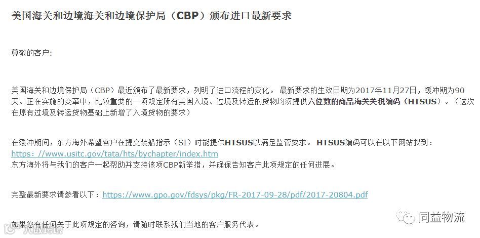 自2017年11月27日起(缓冲期为90天),所有美国入境、过境及转运的货物均须提供六位数的商品海关关税编码(HS CODE)。