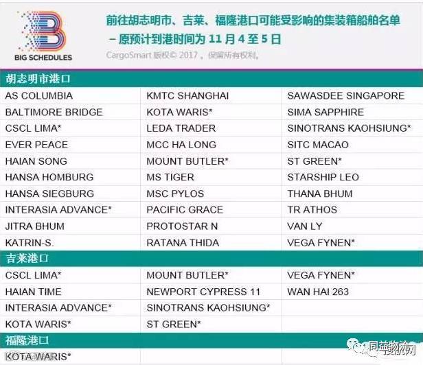 根据大船期持续监控港口状况及其对于前往该港口船舶船期的影响。以下33艘集装箱船舶船期可能受到影响,这些船舶的原定预计到港时间为11月4至5日: