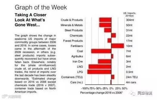 2006年北美集装箱进口量占据全球海运集装箱贸易总量的18%,同时美国在全球海运原油贸易中的份额也达到22%,但是这些数字在2016年分别下滑至13%和12%。造成这一变化的部分原因是中国和其他亚洲新兴国家快速的经济发展逐渐削弱了美国在全球海运市场中的份额。事实上,对于许多主要的海运贸易货物,美国的进口量都在下滑。不过其进口总量仍十分客观,所以美国海运贸易结构的变化依然是影响市场的重要因素。美国对于图中选取的海运货物的进口总量占据了全球海运贸易量的6%。