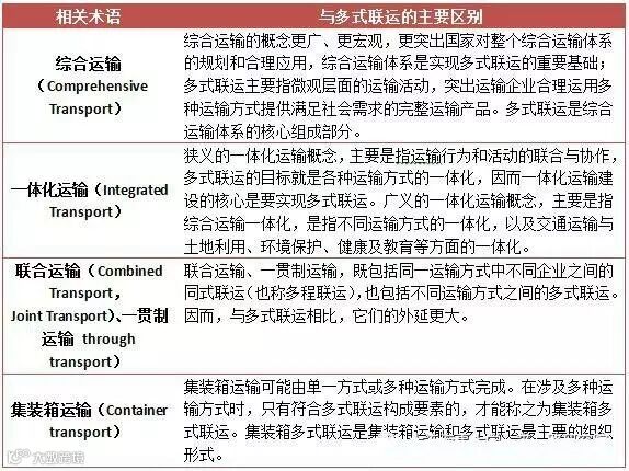 下图表1显示了多式联运与其相关术语的主要区别。集装箱作为标准装载单元,在转换运输方式时可以做到只对集装箱而不对货物本身进行操作,为建立“一次装箱、一箱到底、全程服务”运营模式奠定了基础,也为推行“一次托运、一次计费、一次保险、一票到底”单证体系带来了便利。
