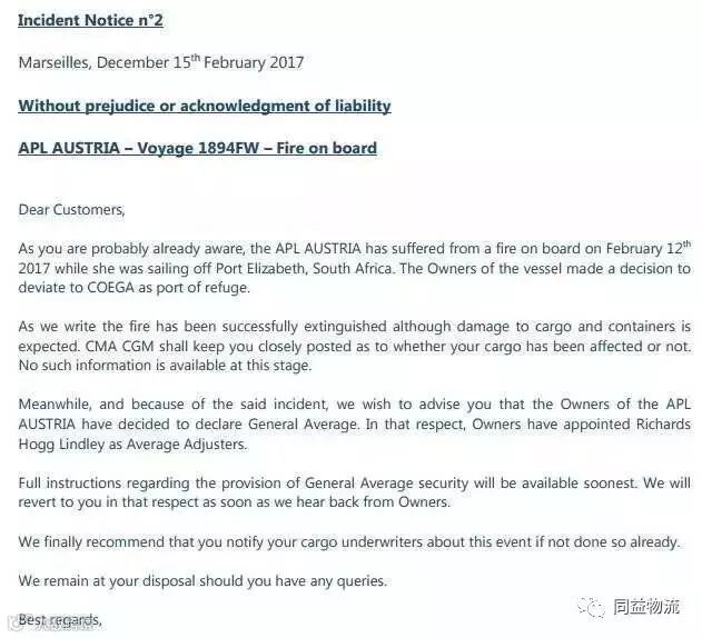同益物流2月13日,APL公司一艘由中国开往西非地区的大型集装箱船舶,船名为APL AUSTRIA (6,350teu)的集装箱船,在位于南非伊丽莎白港Algoa湾Coega锚地附近突发大火。