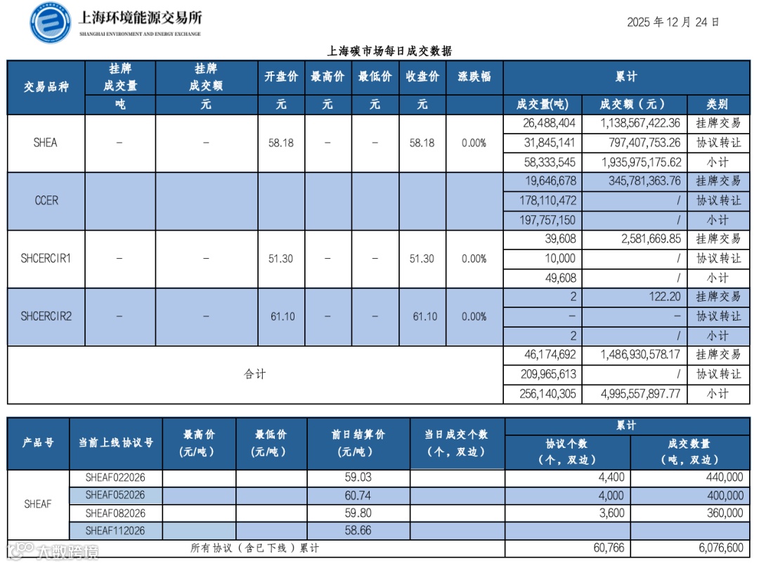 截至今日,上海碳市场所有现货品种累计成交量256,140,305吨,累计成交金额4,995,557,897.77元。其中,配额累计成交58,333,545吨,成交金额1,935,975,175.62元;CCER累计成交197,757,150吨;SHCERCIR1累计成交49,608吨;SHCERCIR2累计成交2吨。上海碳配额远期产品累计成交数量6,076,600吨。