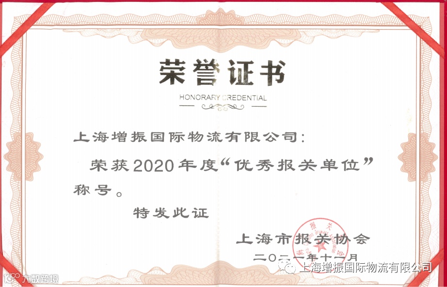 祝贺 上海增振国际物流有限公司 荣获2020年度上海关区“优秀报关单位”称号!