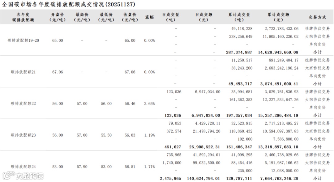 截至2025年11月27日,全国碳市场碳排放配额累计成交量815,499,696吨,累计成交额54,444,392,683.06元。