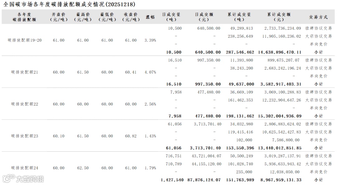 2025年1月1日至12月18日,全国碳市场碳排放配额成交量210,360,645吨,成交额12,899,063,689.18元。