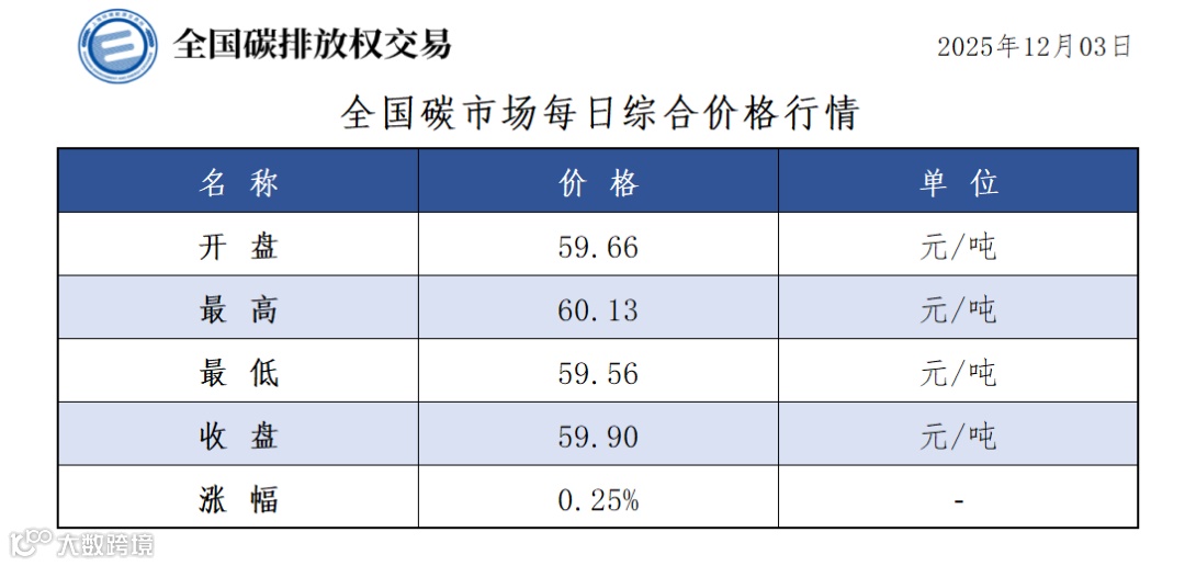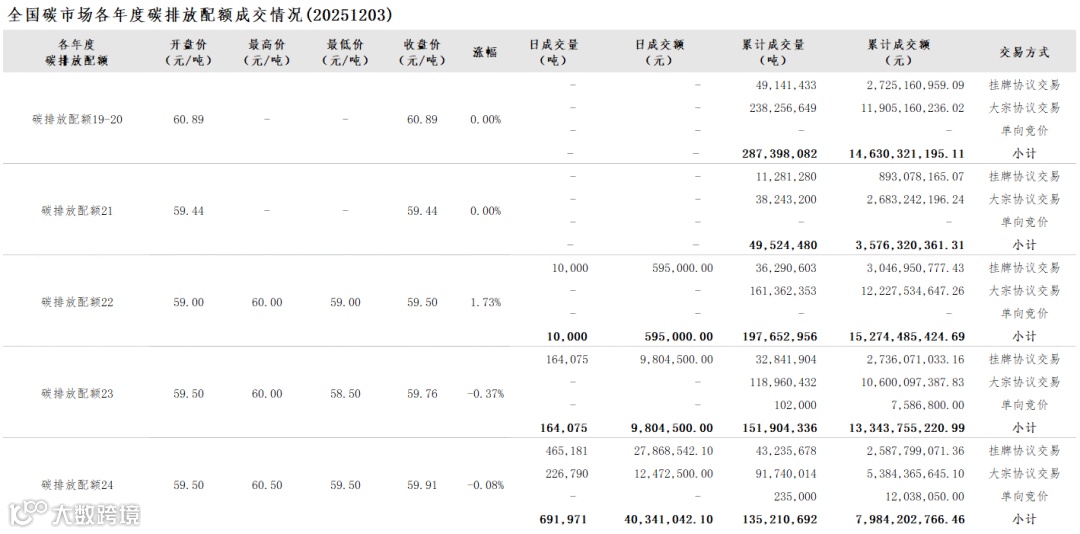2025年1月1日至12月3日,全国碳市场碳排放配额成交量191,421,882吨,成交额11,776,357,865.05元。
