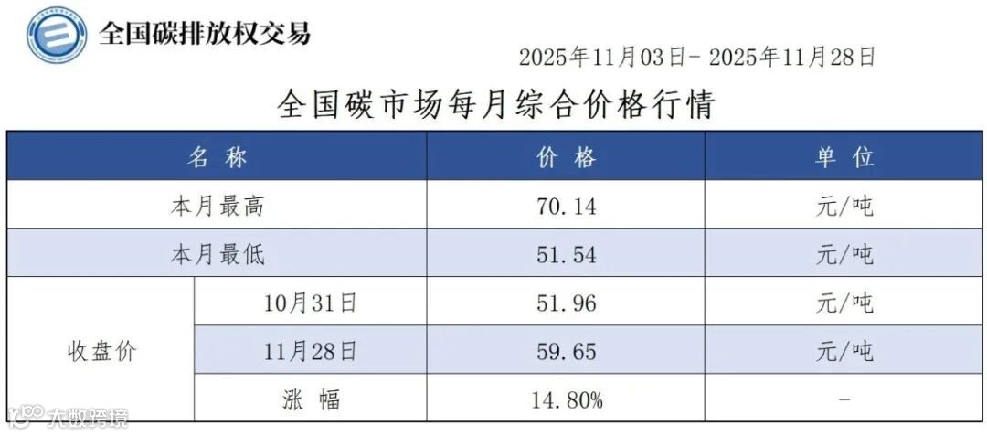 本月全国碳市场综合价格行情为:最高价70.14元/吨,最低价51.54元/吨,收盘价较上月最后一个交易日上涨14.80%。