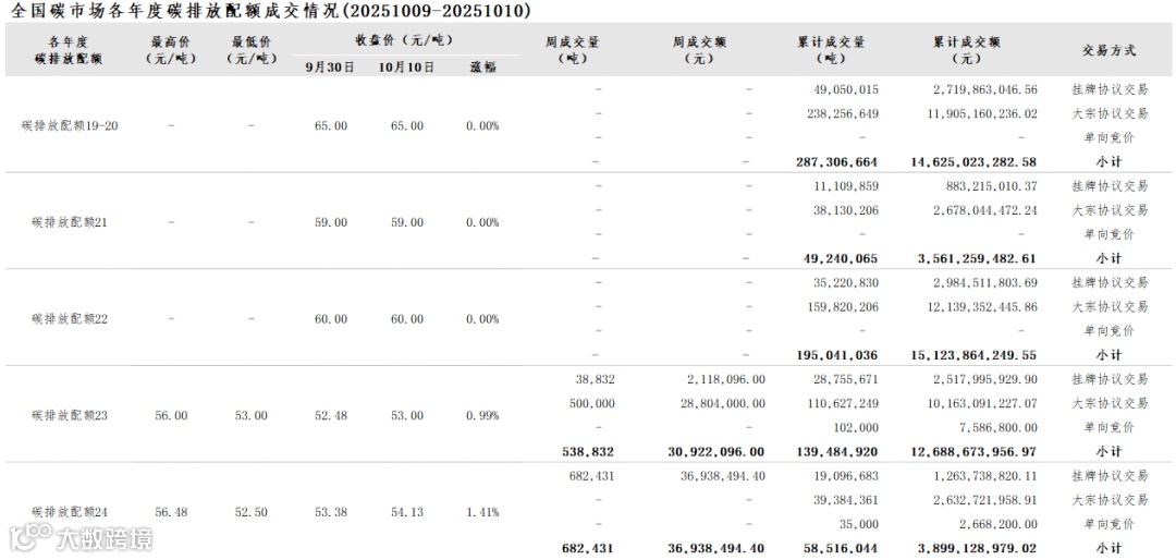 2025年1月1日至10月10日,全国碳市场碳排放配额成交量99,320,065吨,成交额6,865,222,847.22元。