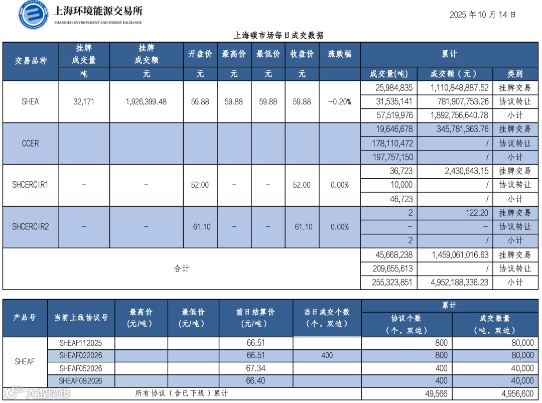 截至今日,上海碳市场所有现货品种累计成交量255,323,851吨,累计成交金额4,952,188,336.23元。其中,配额累计成交57,519,976吨,成交金额1,892,756,640.78元;CCER累计成交197,757,150吨;SHCERCIR1累计成交46,723吨;SHCERCIR2累计成交2吨。上海碳配额远期产品累计成交数量4,956,600吨。