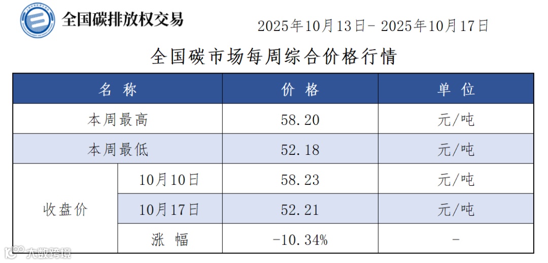 本周全国碳市场综合价格行情为:最高价58.20元/吨,最低价52.18元/吨,收盘价较上周五下跌10.34%。