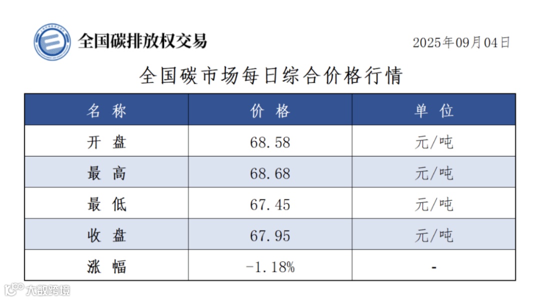 今日全国碳市场综合价格行情为: 开盘价68.58元/吨,最高价68.68元/吨,最低价67.45元/吨,收盘价67.95元/吨,收盘价较前一日下跌1.18%。