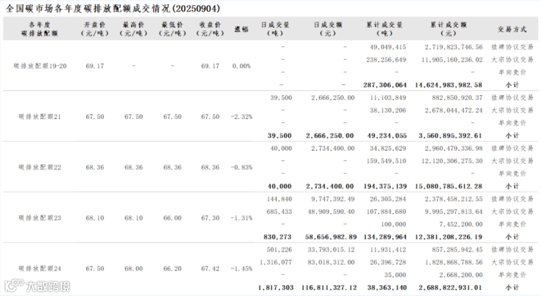 截至2025年9月4日,全国碳市场碳排放配额累计成交量703,568,362吨,累计成交额48,336,696,144.67元。