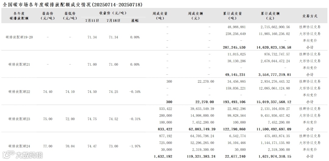2025年1月1日至7月18日,全国碳市场碳排放配额成交量45,083,303吨,成交额3,374,677,828.24元。