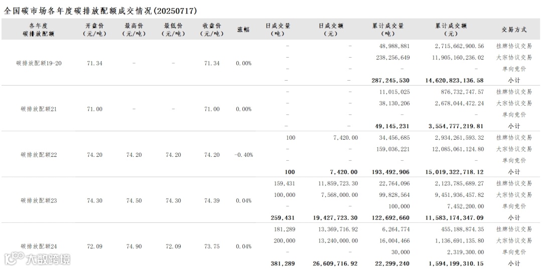 2025年1月1日至7月17日,全国碳市场碳排放配额成交量44,606,903吨,成交额3,339,569,628.24元。