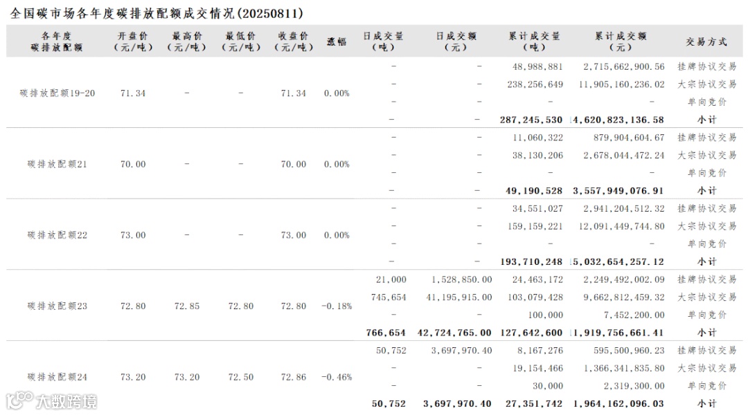 2025年1月1日至8月11日,全国碳市场碳排放配额成交量54,871,984吨,成交额4,062,618,124.54元。