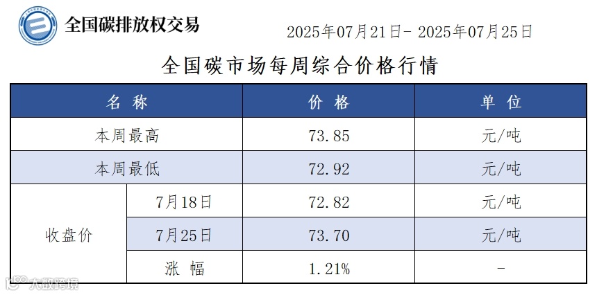 本周全国碳市场综合价格行情为:最高价73.85元/吨,最低价72.92元/吨,收盘价较上周五上涨1.21%。