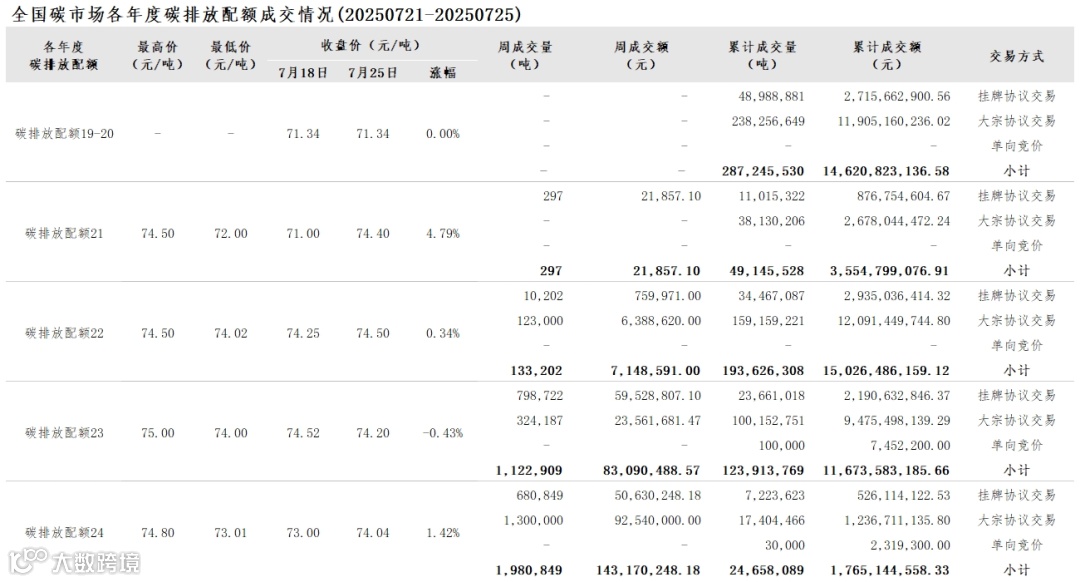 2025年1月1日至7月25日,全国碳市场碳排放配额成交量48,320,560吨,成交额3,608,109,013.09元。