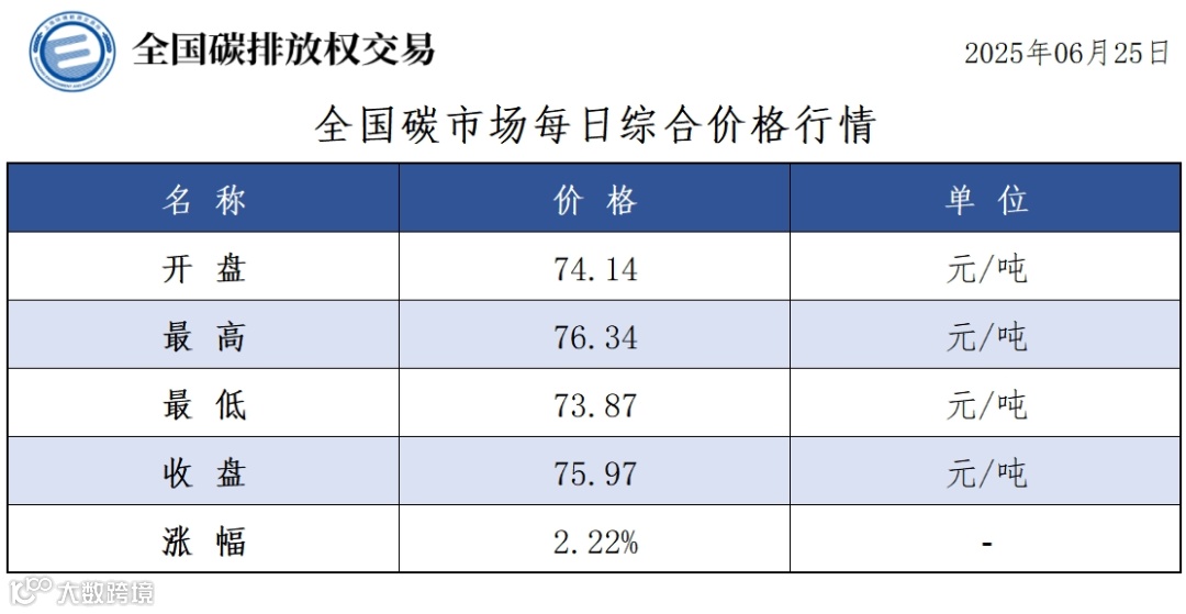 今日全国碳市场综合价格行情为: 开盘价74.14元/吨,最高价76.34元/吨,最低价73.87元/吨,收盘价75.97元/吨,收盘价较前一日上涨2.22%。