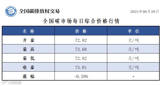 今日全国碳市场综合价格行情为: 开盘价72.82元/吨,最高价73.68元/吨,最低价72.82元/吨,收盘价73.01元/吨,收盘价较前一日下跌0.59%。