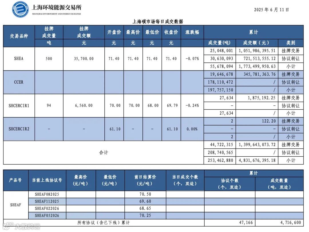 SHCERCIR1挂牌交易成交94吨,成交额6,560.00元,收盘价69.79元/吨,较上一交易日收盘价下跌0.24%。