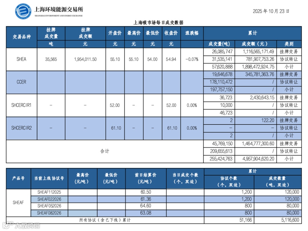 截至今日,上海碳市场所有现货品种累计成交量255,424,763吨,累计成交金额4,957,904,620.20元。其中,配额累计成交57,620,888吨,成交金额1,898,472,924.75元;CCER累计成交197,757,150吨;SHCERCIR1累计成交46,723吨;SHCERCIR2累计成交2吨。上海碳配额远期产品累计成交数量5,116,600吨。