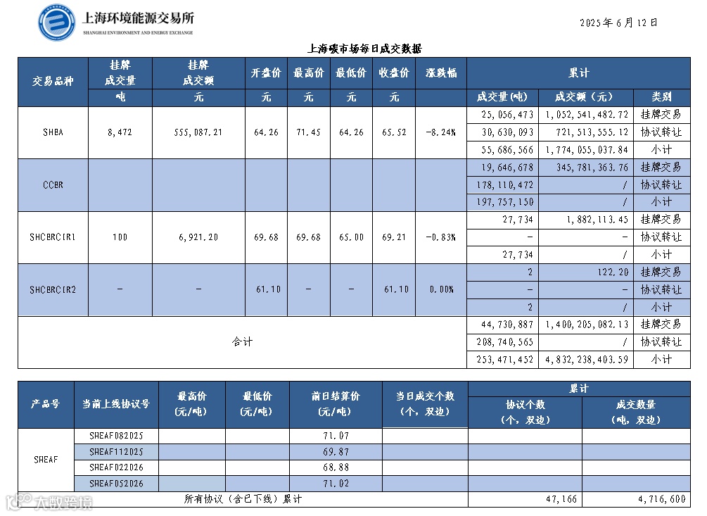 截止今日,上海碳市场所有现货品种累计成交量253,471,452吨,累计成交金额4,832,238,403.59元。其中,配额累计成交55,686,566吨,成交金额1,774,055,037.84元;CCER累计成交197,757,150吨;SHCERCIR1累计成交27,734吨;SHCERCIR2累计成交2吨。上海碳配额远期产品累计成交数量4,716,600吨。