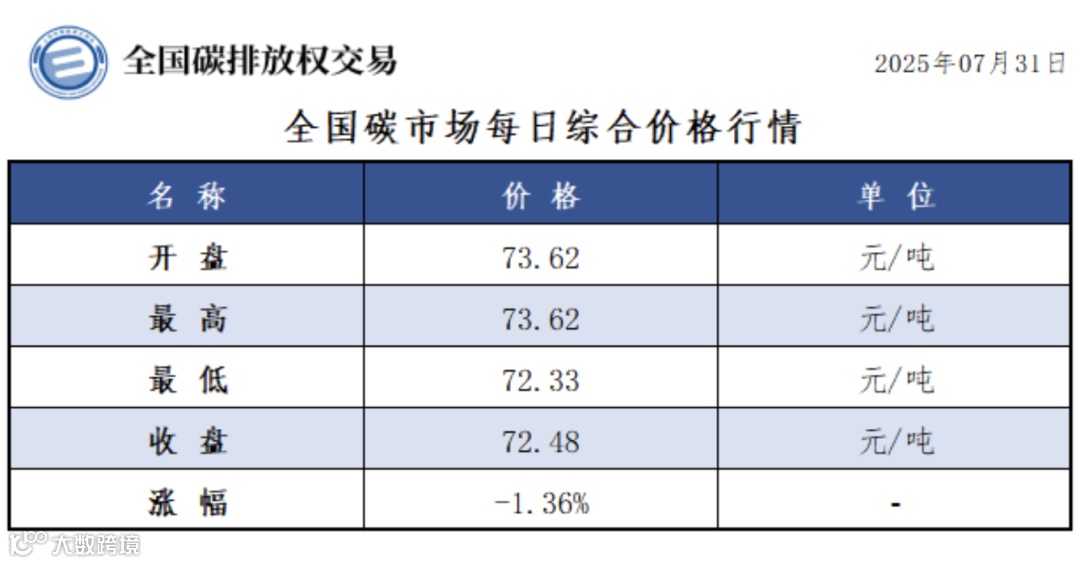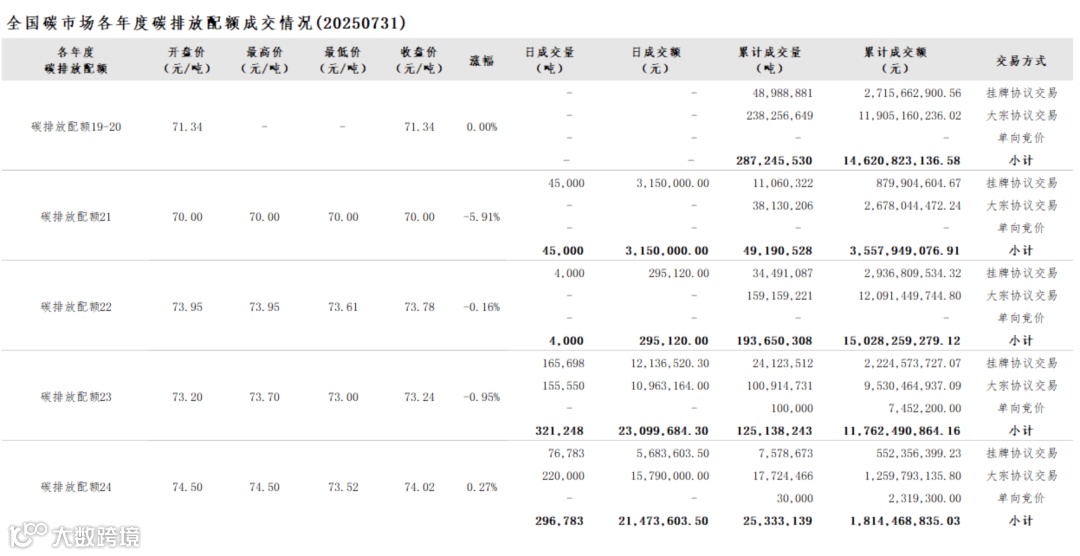 2025年1月1日至7月31日,全国碳市场碳排放配额成交量50,289,084吨,成交额3,751,264,088.29元。